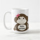 Genießen Sie Ihren Drink mit dieser Tasse, die von einem humorvollen kleinen Affen mit einem breiten Lächeln, dunkelbraunem Fell und einem rosa Haarbogen geschmückt ist. Es ist Set vor einem weißen Hintergrund, gesprenkelt mit rosa Punkten und gerahmt durch einen rosa Rand. Der Begriff "kleiner Affe" ist auf Ihre Vorlieben zugeschnitten.