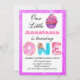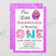 Lila Glitzer zum ersten Geburtstag mit Donut und Süßigkeiten. Fügen Sie einfach Ihren vollständigen Namen und Datum, Uhrzeit und Adresse der Geburtstagsparty hinzu. Perfekt für eine süße kleine Prinzessin, die sich um eins dreht!