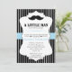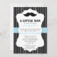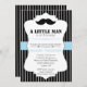 Diese wertvolle Babydusche lädt Sie ein, Ihre Gäste zu einer neuen Ankunft einzuladen. Das Design hat einen schwarz-weißen Fliesenboden, der in der Mitte mit einem weißen und einem blauen Band aufwartet. Oben ist eine schwarze Grafik eines Schnurrbarts. Ihre Party-Details gehen unter die Mitte und sind vollständig anpassbar. Fügen Sie einfach Ihre Duschdetails hinzu und Sie sind bereit zu gehen!