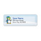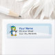 Ein kleiner Pinguin-Cartoon mit Hut und Schal, der auf Schnee geht.