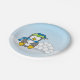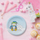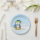 Ein kleiner Pinguin-Cartoon sitzt und hält einen Schneeball.