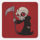 Vector Cartoon Illustration eines kleinen Grim Sensenmann mit roten Augen, die einen Schwanz halten.
