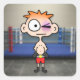 Niedlicher Cartoon Boxer mit orangefarbenen Haaren und roten Hosen, stehend vor dem Ring mit einem großen lila Shiner. Dieser kleine Typ ist ein Meister in der Herstellung!