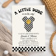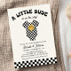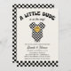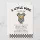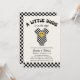 Diese niedliche, stilvolle Babydusche lädt mit einem Baby-Karosseriebord im Schachbrettmuster und einem gelben gelben gelben Lächeln zum Verweilen ein. Retro-Typografie lautet: "Ein kleiner Typ ist unterwegs!" Ein weißes und schwarzes Schachbrettmuster betont den Boden und die Rückseite der Einladung. Perfekt für einen kleinen Jungen unterwegs!