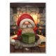 Kleiner Weihnachtsmann, der ein Geschenk vor dem gemütlichen Kamin packt
