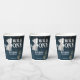 Kleiner Wolf Thema Geburtstagsparty wilde ein personalisiertes Papier Becher , niedlich hewling Wolf pup dunkelsternige Nacht Hintergrund.