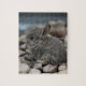 Fotografie eines kleinen Babyhäschens, das auf einigen Felsen am Rand des Wassers sitzt.
