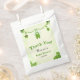 Jede Tasche präsentiert ein handgezeichnet Design eines grünen Babyoutfit mit einem Kleeblatt-Muster, das anmutig von einem Kleeblatt hängt, gepaart mit Kobelschuhen und einem passenden Hut.