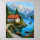 Das Bild ist ein Gemälde eines kleinen Hauses mit einem roten Ziegeldach. Das Haus liegt am Ufer eines Sees, mit einer kleinen Insel davor. Die Insel ist von üppiger Vegetation und farbenfrohen Blume umgeben, und auf dem Wasser gibt es mehrere kleine Boote. Im Hintergrund gibt es Berge und einen klaren blauen Himmel. Die allgemeine Stimmung des Bildes ist friedlich und ruhig.