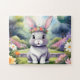 Aquarellmalerei eines bezaubernden kleinen Kaninchens mit einer Blume-Krone vor einem blumigen Hintergrund.