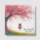 Ein junges Mädchen in einem rosa Kleid sitzt auf einem Schaukel, der von einer Kirschblüte hängt, um eine Gedenkfeier oder Beerdigung zu erhalten. Alle Texte können geändert werden.