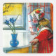 Vintage Wasserfarbe in hellen Farben. Kleines Mädchen in rotem Kleid und Motorhaube sieht sich eine Vase der Iris an, die auf dem Tisch sitzt. Schöne Kunst des schwedischen Malers Carl Larsson.