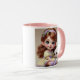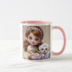 Kleines Mädchen mit Blumenballen und ihrem weißen Tasse