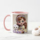 Ein kleines Mädchen mit einem hellen Lächeln und glänzenden Augen, das neben seinem kleinen weißen Welpen sitzt, mit dem Blick, der sie abblickt. Ihr braunes Haar, hübsch geflochten und gewellt, wird von einem feinen Lavendelbanner mit kleinen violetten Blumen und grünen Blättern überschattet, der eine raffinierte und poetische Taste hinzufügt. Sie trägt ein blassgelbes Kleid mit Spitzen-Details und lila Fliesenkorte, verbunden mit ihren Socken und eleganten Schuhen. Ihr Welpen ist ebenso süß und weist einen kleinen Lavendelknoten und eine Kette mit einem herzförmigen Anhänger auf, die ihre Komplizenschaft und die Harmonie des Ganzen unterstreichen. Die Vielfalt der Weizenfarben und Details verleihen der Bühne eine sanfte und warme Atmosphäre, ideal für eine inspirierende Illustration der Welt der Sammlerpuppen und des Kawaii-Stils.