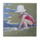 Kleines Mädchen mit Hut am Strand mit Wellen Fliese