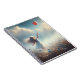 Ein junges Mädchen mit langfließendem Haar hält sich auf einem roten Ballon in einem mistigen Feld mit bunten Wildblumen