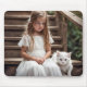 Ein niedliches kleines Mädchen in weißem Kleid, das auf Holztreppen sitzt und eine weiße Katze hat