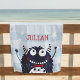Personalisiertes Badetuch für Kinder mit niedlichem Lächeln auf einem Monster, das auf einem Ton mit blauem Streifen auf dem Hintergrund eine dapper Rot-Bug-Krawatte zeigt. Personalisieren Sie den Namen in passendem Rot.