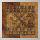Ein in Stein gehaltenes Design eines Schachbrettes mit Set-Up-Stücken, größeren gegnerischen Rittern und gekreuzten Schwertern.