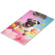 Das verspielte Design zeigt einen fröhlichen Mops im Donut-Schwimmreifen, schwebend auf Zuckerwattewolken, umgeben von bunten Lollis und einem himmlischen Farbverlauf in Pink, Türkis und Pastell.