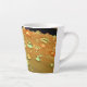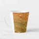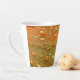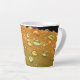 Das Kunstwerk auf dieser kleinen Latte-Tasse ist ein Originalfoto von ZoeSPEAK aus Regentropfen auf einer Manilla-Palmfront. Die rostorangefarbene Fronde ist gekrümmt und bietet uns einen Blick auf die orangefarbenen Wassertropfen von Rost aus verschiedenen Blickwinkeln. Oben in der Kurve sehen wir einen Horizont von Regentropfen vor dunklem Hintergrund. Während sich die Frondkurve dreht, haben die Tröpfchen helle Highlights und werden im Schatten gegenüber der Unterseite kleiner.