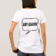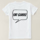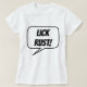 KLICKEN SIE AUF RUST! ESSEN SIE GLAS! Damenschimmel. Doppelseitiger T - Shirt LICK RUST! in Sprachblase vor T - Shirt und EAT GLASS! in Sprachblase auf der Rückseite des T - Shirt.