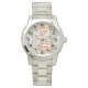 Diese Frauenuhr hat ein modernes Design von Schnürsenkeln, die vertikal in Retrofarben laufen, mit schwarzen Sternexplosionen und Kreise, die über das Design verstreut sind.