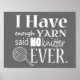 Zeigen Sie Ihre Liebe für Garn und alles Stricken, indem Sie dieses phantastische "Ich habe genug Garn, sagte nie Stricker!" Zitat! Auch macht ein großes Geschenk für die Garn liebende Nadel Jogger in Ihrem Leben! Denken Sie daran, Sie können NIE genug Garn haben!! Design Note: Sieht am besten aus, wenn ein dunkler Hintergrund gewählt wird!