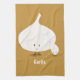 Geschirrtuch mit einer lächelnden Knoblauchknolle und einer Knoblauchzehe. Der Text kann besonders angefertigt werden.