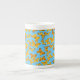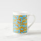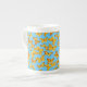 Eine hübsche Knochen-China-Tasse mit einem Muster von goldenen Schmetterlingen, handbemalt in Aquarell von Judy Adamson, auf einem himmelblauen Hintergrund.
