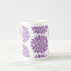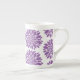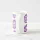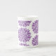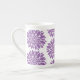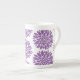 Die Tasse der Knochen-China wird in einem hübschen violetten Blumendruck gezeigt. Passen Sie dieses Objekt an oder kaufen Sie, wie es ist.