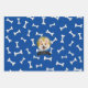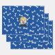 Weißes Knochenmuster mit dem Bild des Hundes in der Mitte. Blaue Hintergrundversion. Maßgeschneidertes Packpapier. Fügen Sie Ihr Bild und den Namen des Hundes, um es anzupassen. Ideal für den persönlichen Gebrauch und für Firmen wie Tierläden, Hundegroßhändler und Hundeschuhwanderer. Geschenkidee und Party für Hundefreunde und ihre Haustiere.