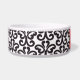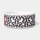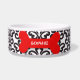 Diese Keramikhundenahrungsmittelschüssel hat ein stilvolles Schwarzweiss-Damaststrudelmuster im Hintergrund. In der Mitte gibt es einen großen roten Knochen mit einem leicht kundengebundenen Namen Ihres Hündchens, das in Weiß geschrieben wird.