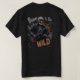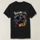 Ein Mann modelliert einen schwarzen T - Shirt mit einer Rock-and-Roll-Grafik eines Skeletts, das eine E-Gitarre spielt, umgeben von Flammen und Rauch, mit dem Text "Knochen zu Wild".