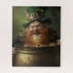 Ein glücklicher Kobold hält sich an einem großen Topf mit einem goldenen Puzzle. Wird in einem Rahmen gut aussehen, nachdem Sie das Rätsel abgeschlossen haben.