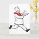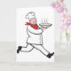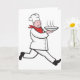 Ein Koch-Design mit einem Unterschied. Dieses Design hat einen Koch, der Essen trägt, und er scheint in einem sehr rasanten Tempo zu laufen. Es ist ein lustiges Design, das eine große Anzahl von Leuten ansprechen wird. Der Koch, der Essen trägt, sieht auf diesen Grußkarten großartig aus