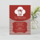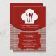 Eine knusprige, rot-weiße Einladung mit einem Hut eines Koch mit Utensilien. Es ist als Post-Hochzeit Brunch Einladung, ist auch ideal für ein Probe-Dinner-Party oder ein Damenluncheon.