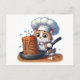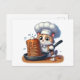 Koch Katze, die einen Hut und Schürze eines weißen Koch trägt und versucht, einen großen Stapel Pfannkuchen in einer Pfanne drehen.