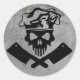 Ein cooler schwarzer Schädel, der eine Karosserie trägt, über gekreuzten Reinigen.