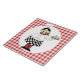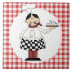 Keramik Fliese oder trivet mit roter und weißer checkered Grenze und mustached dem Koch, die dämpfende Pizza hält. Ein perfekter Zusatz zu irgendeinem Küchen- oder Restaurantdekor.