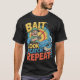 Dieser schwarze T - Shirt ist ein farbenfroher Cartoon, der von einem Fischer entworfen wurde, der in einem Fisch reist. Die Wörter "BAIT", "HOOK", "CATCH" und "REPEAT" werden vertikal in einem spielerischen Schriftart gestapelt, umgeben von Wellen und einem Retrostil-Sonnenbrand. Ideal für Angelfreunde.