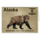 Eine der Briefmarke für eine hypothetische unabhängige Nation Alaska. Ein digitales Gemälde eines Kodiak Bären auf einem neutralen Pergament, oder altes Papier, Hintergrund. Es erscheint auch das Textlesen "Alaska", "Postage 8 Nuggets" und "Kodiak Bear Ursus arctos middendorffi". Der Kodiak-Bär (Ursus arctos middendorffi), eine Unterart des Braunen oder Grizzly, ist der größte Bär der Welt. Ein vollgewachsenes Männchen kann über 1,50 m hoch sein, wenn es aufrecht auf seinen Hinterbeinen steht und über 1500 Pfund wiegt - ein wahrer Anblick. Ein Bär im Bismarck, der Zoo von Nord-Dakota, hat schätzungsweise bis zu 2400 Pfund gewogen. Die Bären leben auf den Inseln des Kodiak-Archipels von Alaska. Heute gibt es ca. 3500 Kodiak-Bären und ihre Anzahl steigt aufgrund der im Allgemeinen ausgezeichneten Lebensbedingungen, inklusive ausreichend Faust zum Essen. Sie werden in Alutiiq "takuka-aq" genannt, der Sprache der Einwohner dieser Gegend. Man glaubt, dass die Bären dort seit gegen Ende der letzten Eiszeit vor über 12.000 Jahren abgeschieden waren. Obwohl sie die größten terrestrischen Fleischfresser sind, umfasst ihre Ernährung große Mengen von Gras, anderen Pflanze und Beeren. Heute gibt es etwa 3500 Kodiakbären, deren Anzahl aufgrund des allgemein ausgezeichneten Zustands ihres Lebensraums, einschließlich ausreichender Fische zum Essen, zunimmt. Aufgrund des Überflusses an Nahrungsmitteln haben Kodiak-Bären kleinere Zuhause-Reichweiten als alle anderen Braunbären und brauchen keine Gebiete zu verteidigen. Die Alutiiq jagen Bären für Nahrung, Kleidung und Werkzeuge. Pfeile, Speere und viel Mut waren notwendig für die Jagd. Bärenköpfe wurden in der Regel auf dem Feld als Zeichen des Respekts vor dem Geist der Bären links.