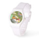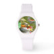Diese Uhr zeigt ein Bild von farbenfrohen Koi-Fischen in einem Teich.
