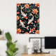 Dieses Bild zeigt eine ruhige Teichszene mit mehreren Koi-Fischen, die anmutig zwischen üppigen Lotus-Blume und Lilienpolstern schwimmen. Die Fische sind eine lebendige Mischung aus Weiß mit roten und orangefarbenen Flecken, was einen starken Kontrast zu den weichen rosa Blüten des Lotus darstellt. Das Kunstwerk hat eine reiche, malerische Textur auf einem dunklen Hintergrund, die die Farben hervorhebt und ein Gefühl von ruhiger Tiefe schafft.