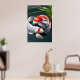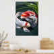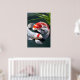 Poster von zwei Koi-Fischen mit komplizierten Mustern, die anmutig nebeneinander vor einem dunkelgrünen Hintergrund schwimmen, hervorgehoben durch die Anwesenheit von ein paar lebhaften grünen Pflanze-Blätter. Die detaillierten Schuppen und zarten Flossen des Koi schaffen eine ruhige und harmonische Wasserszene.