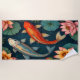 A colorful pair of koi fish swim among water lilies on this beautiful beach towel. Peaceful, serene nature scene.