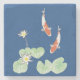 Ein Untersetzer aus Stein mit einem idyllischen Zen Aquarellbild von zwei Koi in einem Koi-Teich mit weißen Wasserlilien und Wasserlilienpolstern (blauer Hintergrund).