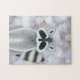 Waschbär (Waldtierportrait) - Illustration von Sarah Knight. Das Bild ist ein Tierportrait aus Holz. Das Thema ist ein Waschbär. Der Waschbär hat schwarze Patches um seine Augen, die eine Maske zu sein scheinen (daher der Spitzname des Banditen). Sein Fell ist grau und weiß, mit dunklen Flecken auf dem Gesicht und den Ohren. Es hat einen gestreiften Schwanz, der ziemlich fließend ist. Der Hintergrund ist mit Buh gefüllt in einer neutralen Palette von Lavendel, Magenta, Salbei, Cloud Blau, Weiß und Grau. Es ist ein skurriles Bild.