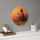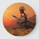 Eine riesige SteinKokopelli Statue sitzen auf einigen Felsen in einer Wüste. Der rote Sonnenuntergang belichtet das trockene Tal, das mit gelben Gräsern und Kakteen gefüllt wird. Die rechte Seite des Bildes wird durch felsige MESAs beherrscht.
