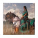 Eine Ureinwohnerfrau reitet einen Dun und weißes gepunktetes ein Mustangpferd durch ein Feld des hohen Grases. Weg in vom Abstand zeichnet ein Wald der Tannenbäume die Wiese. Hinter dem Wald das Scharfe, felsig, Schnee den Spitzenaufstieg umfaßte, der in den Himmel in dem wispy rosa Wolkenantrieb faul vorbei hoch ist. Ein leichter Wind brennt durch, die schwarze Mähne und den Schwanz des Pferds aufhebend. Ihr Sattel und Tracht sind beide Schwarzes mit Türkisfransen. Das sich wiederholende Symbol von Kokopelli, der Ergiebigkeitsgeist, füllen die offenen Räume des Materials. Kokopelli ist eine Ergiebigkeitsgottheit von den Ureinwohnerkulturen des Südwestens. Es wird theoretisiert, dass er nach einer wirklichen Art Person, einer Art reisender Kaufmann, Geschichtenerzähler, Reporter und Entertainer basiert. Sie konnten sagen, dass er der amerikanische Ureinwohner ist, der mit einem europäischen Barden, einem Troubadour oder einem minstral gleichwertig ist. Im Allgemeinen wird er allein dargestellt, aber in etwas Wiedergaben, hat er einen Gemahl oder eine Ehefrau, die als Kokopelmana oder Kokopelli-mana bekannt sind. Hier habe ich sie als wirkliche Person, ein reisender Geschichtenerzähler dargestellt, der ein Pferd durch den amerikanischen wilden Westen reitet.